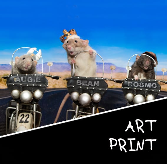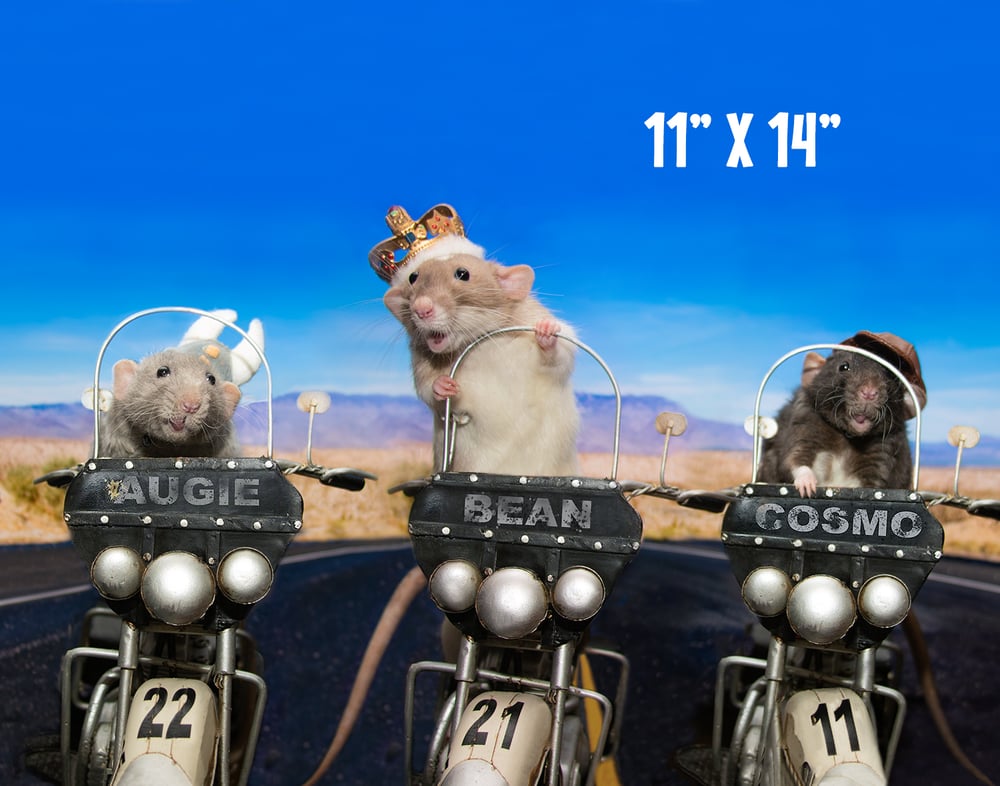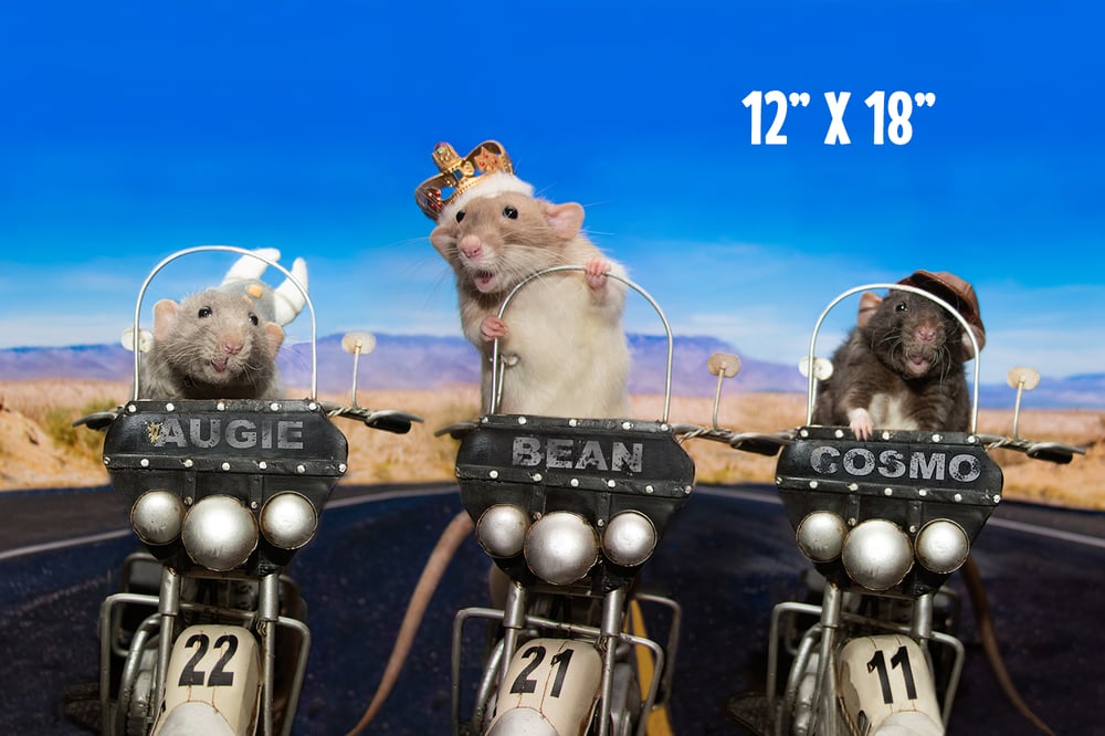 Cosmo, Augie and Bean lub the feel ob the open road, wind in their whiskers... dis captures a moment ob their trip down Route 66.